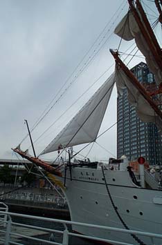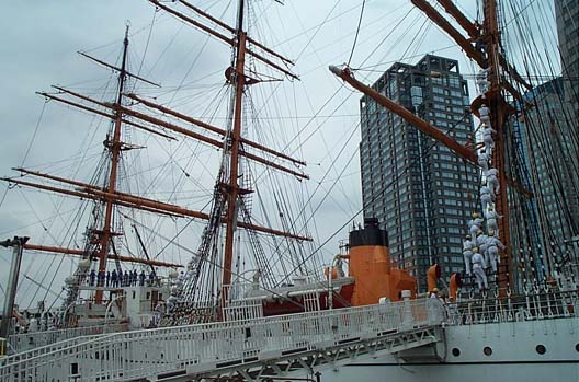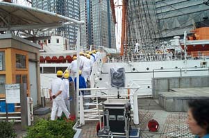 | ボランティアさんと指導員さん達が 乗船していきます。 乗船した後は準備運動を行い、 マストオフィサーより 最終的な注意を受けます。 直前に風向きが変わった為、 展帆手順も変更になり、 いろいろ大変だったようです。 |