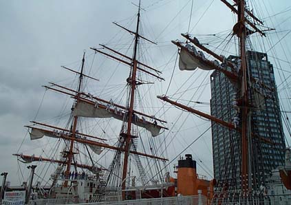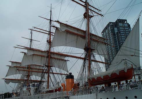 | ちょっとしまらない気もしますが、 これはこれでなかなか見られない 姿なのではないでしょうか。 実際の航海でも、 ストームセールで嵐を突っ切る 機会は滅多にないそうです。 船首の二枚のジブには 風向きを考慮して 角度が付けられているのが わかると思います。 ある程度風があると 帆も膨らんでいい感じですが、 強すぎると危険なので 展帆作業そのものが 中止になってしまいます。 難しいですね。 |