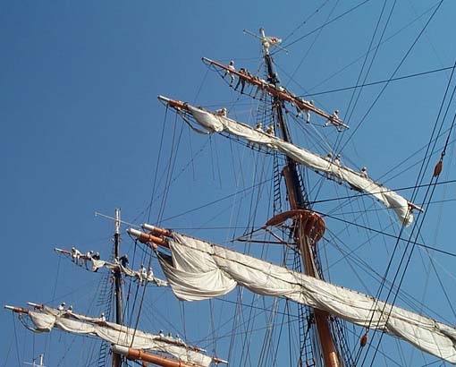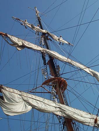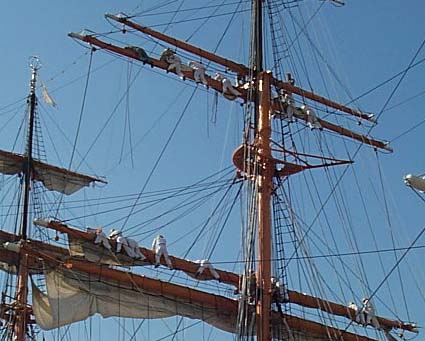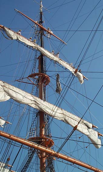 | ボランティアさんと指導員さん達がマストを登っていきます。見ているだけで恐いです。 見えにくいですが、先頭の人はロイヤル・ヤード(一番上のヤード)までたどり着いてます。 前日の雨にぬれた帆を乾かすために作業開始に先だって既に解帆(セールをくくり付けてる紐を解くこと)されていました。 メイン・コースとクロジャッキーはクリーニングだそうで、先に外されていました。 |